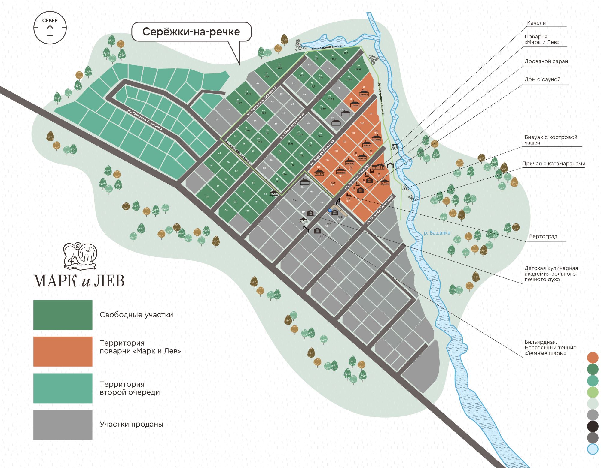 На территории поселка находится поварня «Марк и Лев».Можно уже сейчас, устроив тест-драйв – пожить в одном из четырех уютных гостевых домов, попариться в баньке и прийти на званый обед или ужин в поварню «Марк и Лев».